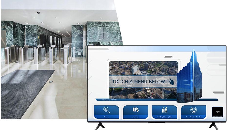 Interactive displays pair well with a full digital signage system in your corporate headquarters. Make important visitors feel welcome with a professional lobby display, and build rapport by communicating company values, history, and interactive storytelling. 3D wayfinding maps help visitors find their destination, and integrate a directory with room reservations to bring the whole system to life.