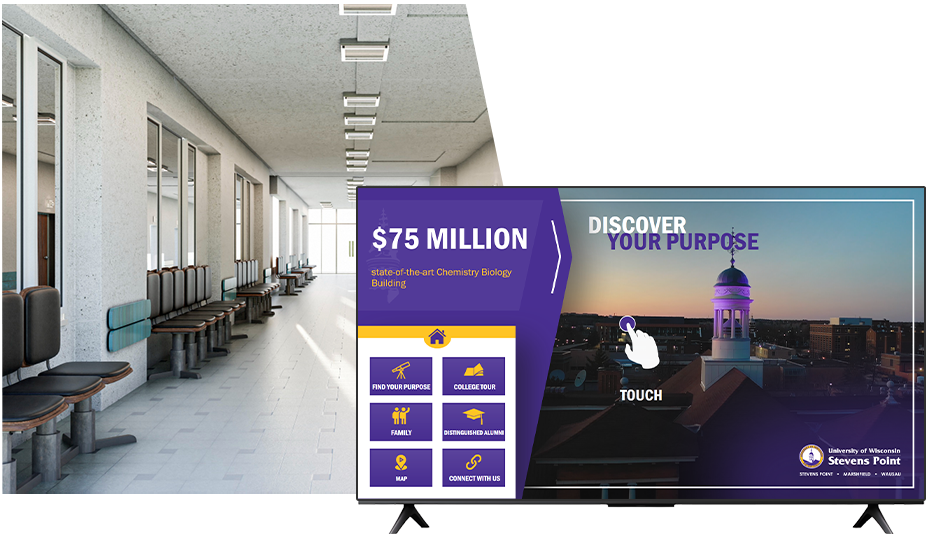 Digital signage makes a fantastic end-to-end experience for current students, prospective students, visitors, alumni, and donors. Interactive displays in the welcome center engage and excite newcomers, hallway displays and wayfinding kiosks direct traffic, donor recognition displays bring a sense of giving to your audience, and internal displays communicate important staff information.