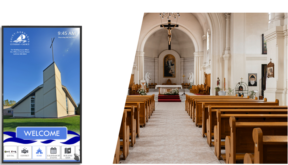 Do you have a church with multi-use spaces? Do you organize a lot of events and need to drive participation rates?  Interactive displays help to make newcomers feel welcome, donors feel appreciated, and existing members more engaged.  Visitors can learn about programs, learn history  view photo galleries, sign up for events and stay in the know for the future. Easy to manage for any technical level.