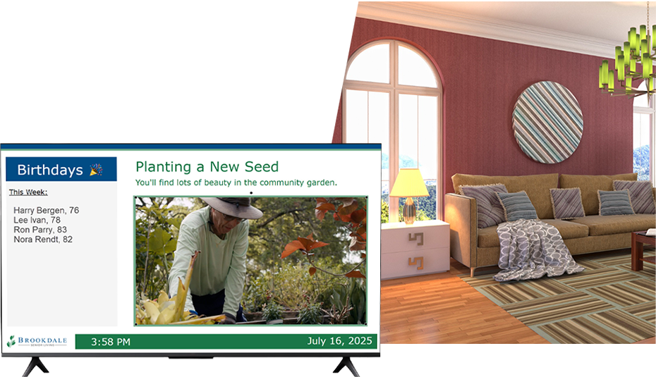 We provide a gentle, reliable way to share updates throughout common areas and living spaces. Keep residents and visitors informed with daily menus, activity schedules, and important announcements. Recognize residents, manage a full birthday/anniversary list, show daily menus and more. Easily control fonts, page durations, and text sizes for readability.